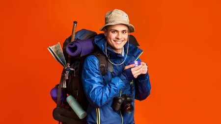 Fully equipped young cheerful backpacker drinking hot tea or coffee, wearing jacket, hat, backpack full of diverse tools, orange studio background