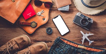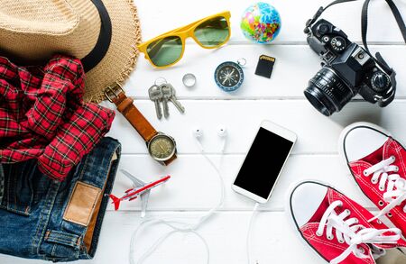 Clothing and accessories for travel on wood background. Travel preparation concept.