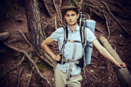 Adventure concept. Young man hiking in the forest. Active lifestyle, tourism. Tourist equipment.