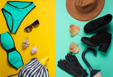 Clothing and accessories autumn and summer beach season on colored paper background. Fashion minimalist concept. Top view