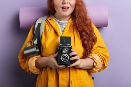 close up cropped photo female adventure holding a camer in hands. travel concept
