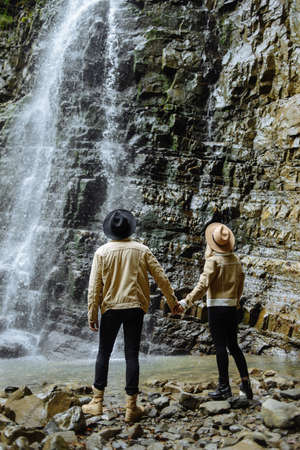 Stylish tourist couple, man and woman, dressed in beautiful chickens, stand holding hands in front of a large waterfall