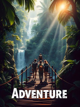 A group of people walking across a wooden bridge over a river, adventure travel concept.