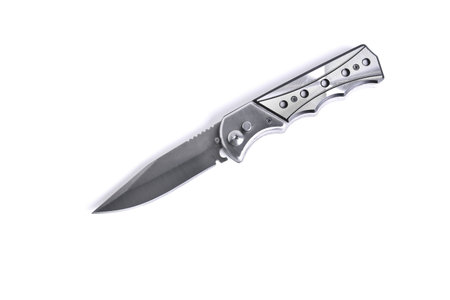 silver folding knife on a white background close-up