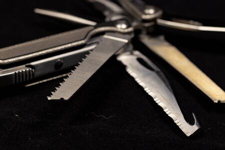Multitool is a multi-functional tool on a black background. The concept of an expanded multi-tool with free space. Clipping path included isolate