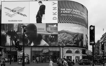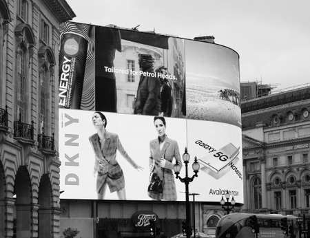 LONDON, UK - CIRCA SEPTEMBER 2019: Billboard at Piccadilly Circus in black and white