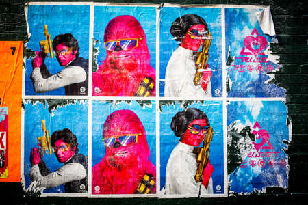 Artistic Urban Street Background with Grungy Wall with Ripped, Torn And Peeled Posters. Old Wall with Scratched Advertising. Old Billboard with Torn Posters. Vintage Wide Background and Texture.