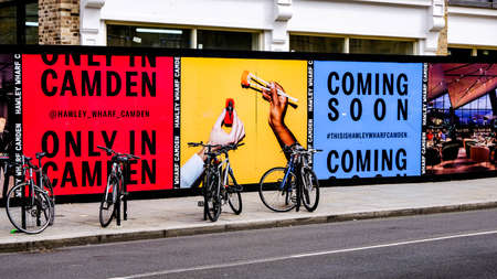 Advertising Hording Or Posters Camden Market London, UK With Parked Bicycles And No People