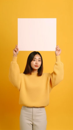 Generative AI : Cheerful young woman smiling for camera and holding at empty banner against yellow background