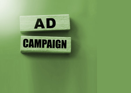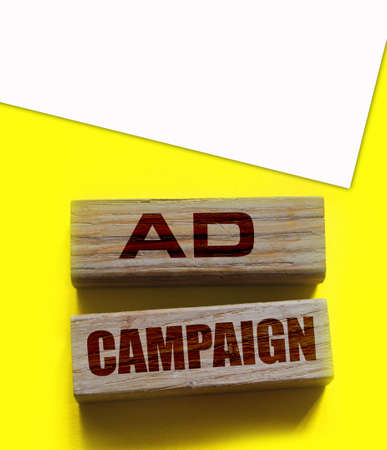 Ad Campaign on Wooden Blocks on yellow background. Marketing advertising Business Concept.