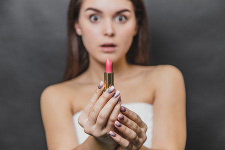 Close up portrait of gorgeous girl wears white towel and holds red lipstick.
