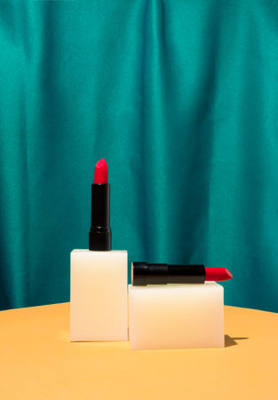 Minimal retro style scene with red lipstick on bright sandy table and vintage silk green curtain. Creative beauty product display. Valentines day gift.