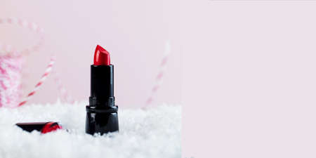 Banner red lipstick tube and Christmas tree baubles on artificial snow pile. Copy space.