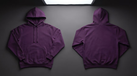 A simple yet stylish purple hooded sweatshirt displayed from both the front and back, laid flat on a dark surface under bright studio lights, perfect for apparel mockups or product showcases.