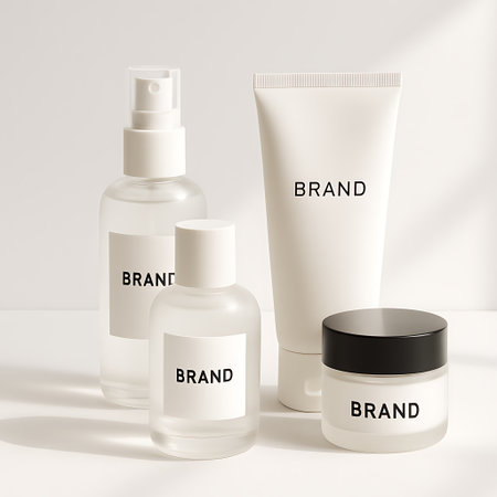 Collection of skincare jars, tubes, oils, and serums displayed on a white surface, providing ample room for promotional text or branding.