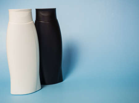 pure black and white shampoo bottle on blue background, men's and women's shampoo, copy of the space