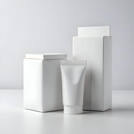 Minimalist mockup of three blank white product containers a tube. a box. and a square container. Perfect for showcasing your brand design.