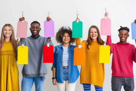 A smiling, multicultural group of young adults holding up large blank colorful tags against a white background.