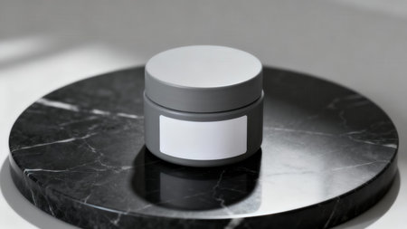 Transparent unbranded cream jar with white product mockup sits on a dark, reflective black marble plinth, contrasting the bright white substance and neutral background.