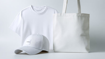 White T-shirt, matching cap, and tote bag mockup display, minimalistic arrangement, isolated on pure white background, professional studio lighting