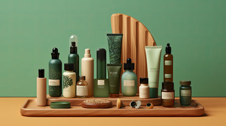 A carefully arranged collection of organic wellness products, wooden elements, and earthy textures showcases a serene and sustainable lifestyle. Perfect for health and beauty themes.