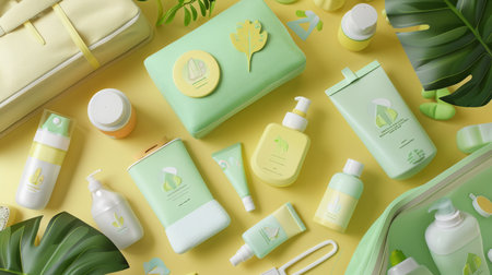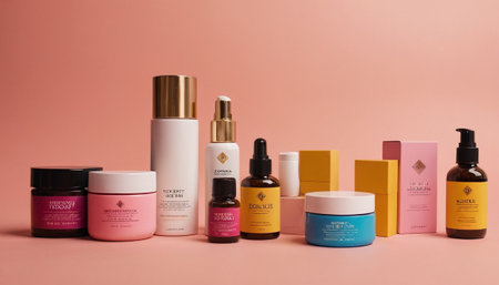 Skincare and beauty products are artistically displayed on a pastel surface, highlighting various colors and textures in a relaxed, wellness-focused atmosphere.