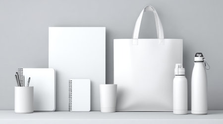 Blank promotional merchandise mockup featuring a polo shirt. tote bag. mug. water bottle. notepad. and other customizable items. Perfect for showcasing your brand or designs!