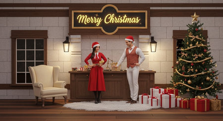 Two baristas working behind the counter in a cozy coffee shop, preparing hot beverages and pastries amidst festive decorations and a beautifully adorned christmas tree
