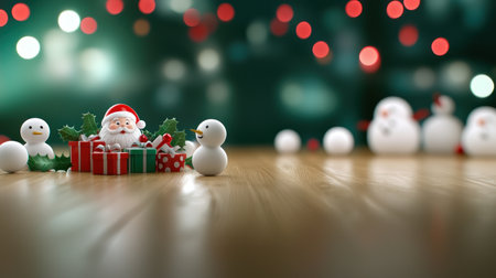 A festive Christmas scene featuring Santa Claus, a snowman, a miniature house, decorated trees, and gift boxes, all set against a warm, glowing background.