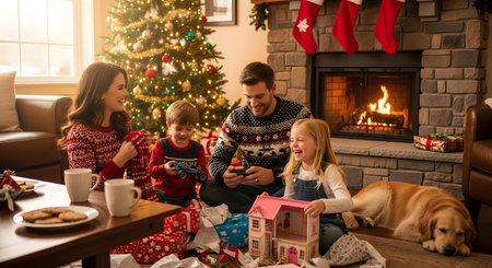 A happy family of four (mother, father, son, daughter) is gathered in a cozy living room, opening Christmas presents. A golden retriever dog rests nearby. There is a decorated Christmas tree, a lit fireplace with stockings, and piles of gifts.