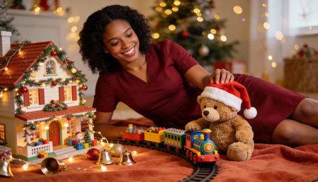 Joyful woman relaxing by festive christmas tree with toy train set, plush bear in santa hat, and illuminated miniature holiday house.