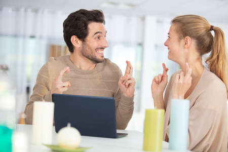 couple with their fingers crossing at home