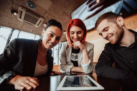 Multiethnic group of young people having a coffee break in a cafe
