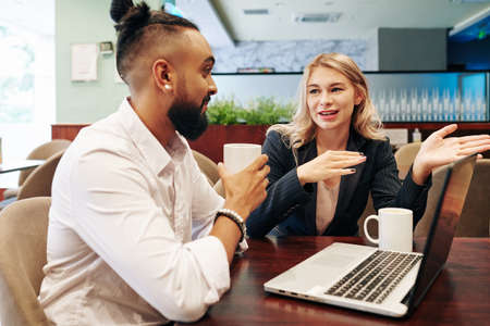 Two young intercultural colleagues in casualwear discussing online data on screen of laptop held by black woman while preparing presentation