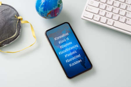Coronavirus or Covid-19 outbreak Social media hashtag background concept. Mockup mobile phone with coronavirus hashtags on working office desk table workspace.