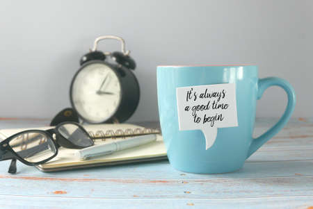 A notebook,glasses,pen,notebook,vintage alarm clock, and a mug with speech bubble written with inspirational motivation quotes It's always a good time to begin.