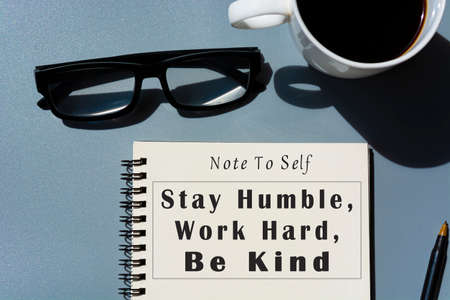 Motivational and inspirational quote on notepad with potted plant, glasses and a pen - Stay humble, work hard, be kind.
