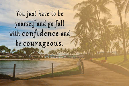 Motivational quote on blurred palm trees and tropical beach - You just have to be yourself and go full with confidence and be courageous.