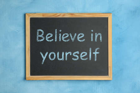 Small chalkboard with motivational quote Believe in yourself on light blue background, top view