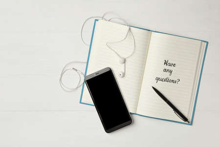 Notebook with phrase HAVE ANY QUESTIONS and smartphone on white wooden table, flat lay