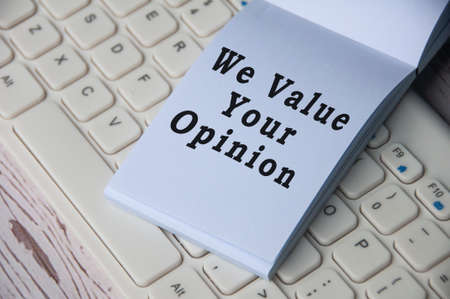 We value your opinion text on notepad on top of keyboard.