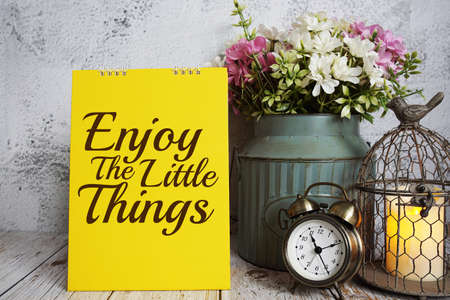 Enjoy the Little Things text message with alarm clock and Led cancle light decoration on wooden background
