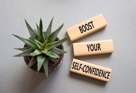 Self-confidence symbol. Concept word Boost your Self-confidence on wooden blocks with succulent. Beautiful gray background. Business lifestyle and Self-confidence concept. Copy space