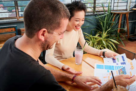 Handsome young ux designer with documents in hands listening to ideas of his coworker at meeting in cafe