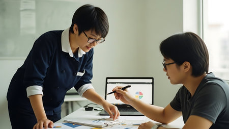 Two young professionals collaborate over a laptop in a modern office, discussing ideas and strategies while enjoying coffee, highlighting teamwork and innovation.