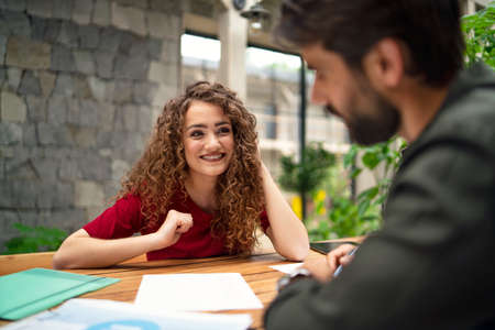 Two of young colleagues are having a good time while chatting at work in a pleasant atmosphere in the office