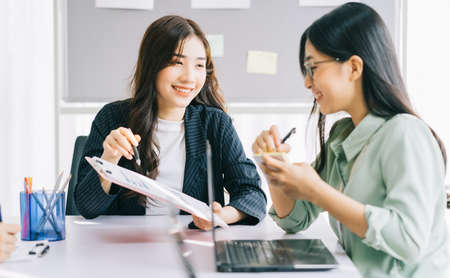 Two young Asian businesswoman discuss investment project working and planning strategy. Business people talking together with laptop computer at office.