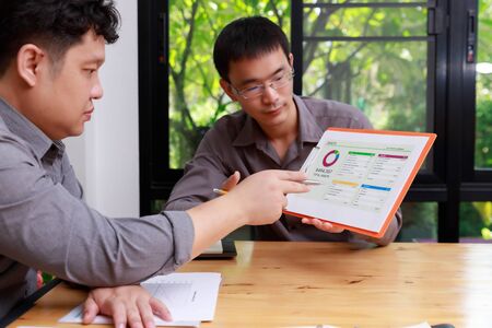 Two businessmen are meeting together on the topic of monthly finance, financial documents prepared by the finance department. Concept of financial management according to company policy.