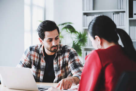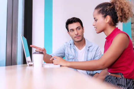 Two businesspeople colleagues talking about planning project in the workplace. Man pointing to laptop with woman sitting on desk with computer and cup coffee talking about work together in office.