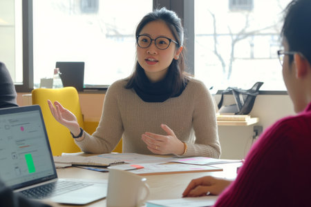 Young adult Asian woman discussing app design with UX developers in a bright office space, laptop open to wireframes and notepad filled with sketches